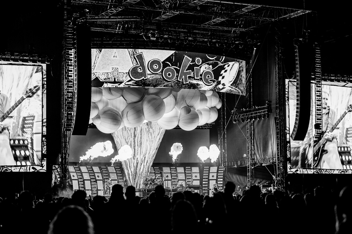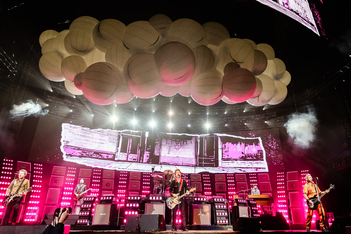 After over 3 decades of being a band, Green Day has seemingly perfected the art of creating a spectacle. Not only was there an entire pyrotechnic show and a dozen confetti blasters all synced to cues in their performance, but their team effectively brought the album cover of Dookie to life with a huge blow up replica of the iconic explosion, and later flying a blimp of the bomb dropping planes depicted as well. When it was American Idiot’s time to shine, the Dookie elements were substituted by a giant balloon of the album’s artwork – A bleeding heart shaped hand grenade clenched in a fist.